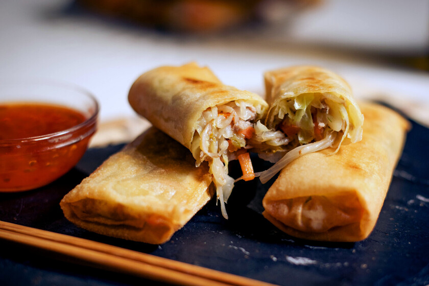 Fríe los rollos de 2 a 3 minutos por lado, hasta que estén dorados y crujientes.